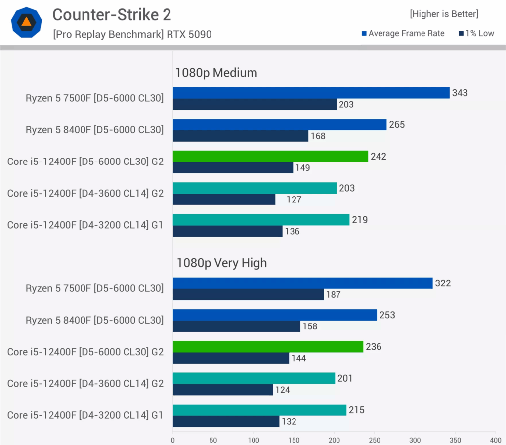 یکی از محبوبترین بازیهای حال حاضر دنیا بدون شک Counter-Strike 2 است. این بازی به واسطه نحوه عجیب استفادهاش از منابع، نتایجش با سایر بازیها بسیار متفاوت است. زیرا رم DDR4-3200 در حالت Gear 1 حدود ۷ تا ۸ درصد سریعتر از DDR4-3600 در Gear 2 بود. همچنین DDR5 حدود ۱۸ درصد سریعتر از DDR4-3600 بود اما تنها ۱۰ درصد سریعتر از DDR4-3200 عمل کرد.