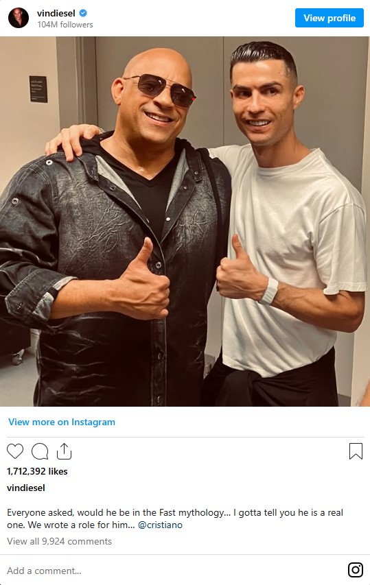 وین دیزل در اینستاگرام عکسی از خود در کنار رونالدو پست کرد و با کپشن زیر، اعلام کرد که نقشی برای او در دنیای Fast & Furious نوشته است: