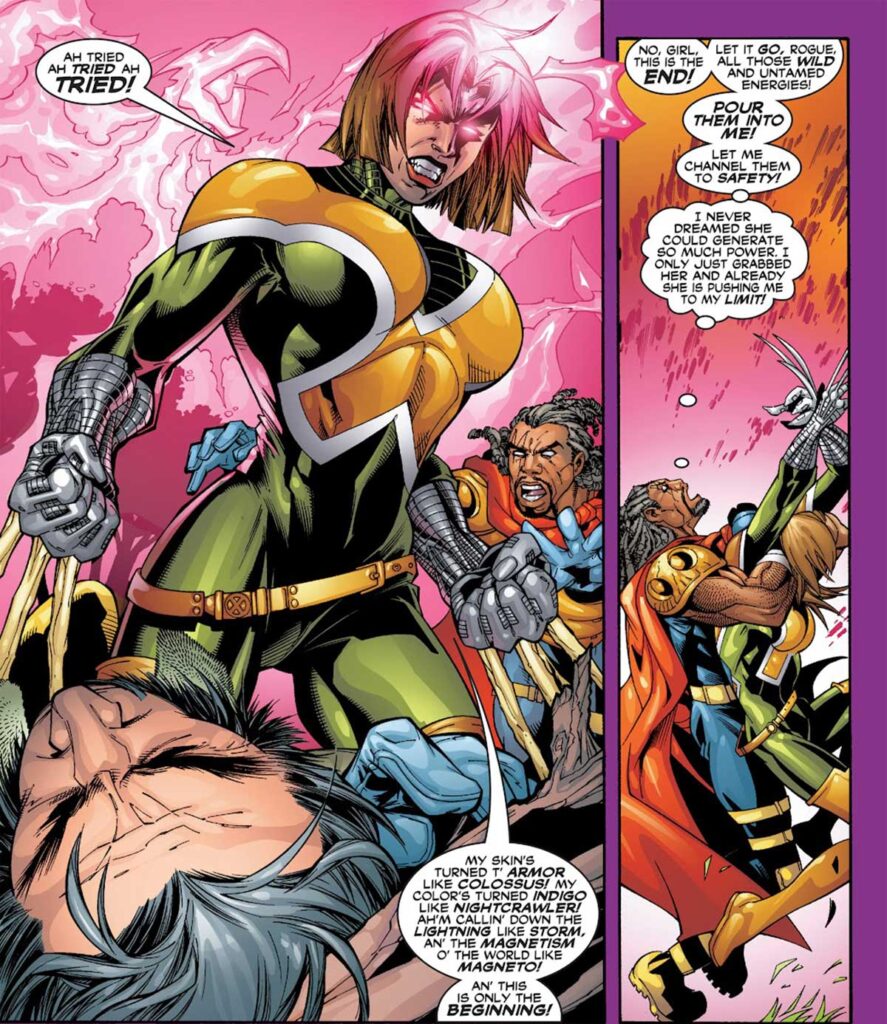 وقتی که ایکس-من چندین بحران را تجربه کردند، آنا از کنترل پیشرفته خود بهره برد تا به طور مداوم و بدون آسیب، مقدار اندکی نیرو از همتیمیهایش به دست آورد. روگ هر از چند گاهی چندین قابلیت را در یک آن جذب میکرد تا در برابر خطراتی به سان پردتور ایکس یا بسشن قرار بگیرد. هنگامی که آنا مری به اونجرز یونیتی اسکواد پیوست، در شماره ۲۱ کمیک Uncanny Avengers تواناییهای چندین اونجرز و ایکس-من را برای مقابله با یک سلستیال به دست آورد. با همه این شرایط، فشار روانی این شیوه برای روگ به مقداری سنگین بود که اسکارلت ویچ مجبور شود تا بیشتر قابلیتهای قرضگرفته آنا را حذف کند.