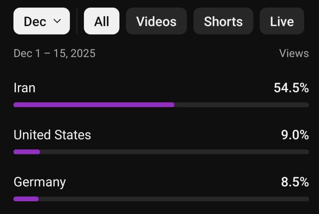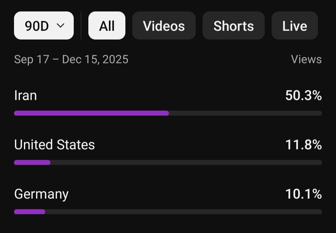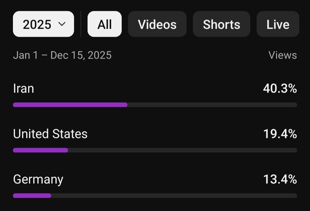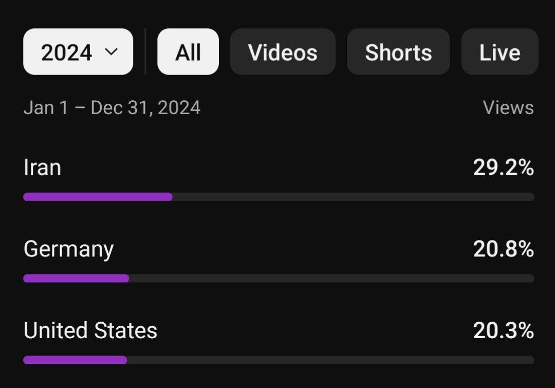 این اتفاق برای کانال یوتیوب ویجیاتو هم صدق میکند. دو تصویر زیر سهم کاربرهای ایرانی در سالهای ۲۰۲۴ و ۲۰۲۵ را نشان میدهد و میتوانید ببینید چه قدر بین درصد این قشر تفاوت وجود دارد.