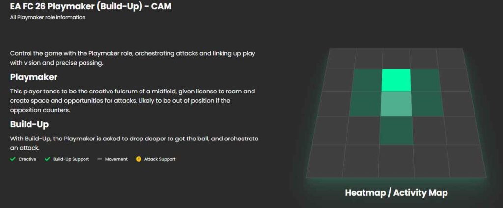 نقش اصلی بازیسازی را داخل بازی FC 26 به هافبکهای هجومی اختصاص دادهایم و Player Role مخصوص آنها Playmaker – Build-Up است. این یعنی شما با یک هافبک خلاق روبرو میشوید که کمی به عقب بر میگردد تا توپگیری کند و به طور همزمان مدافعان را از پست خود بیرون میکشد. ایدهآلترین بازیکنان برای این پست فلوریان ویرتز و جود بلینگهاماند چون به شکلی سریع توپ را به سمت جناحین، مهاجم نوک و مرکز زمین با خود حمل میکنند.