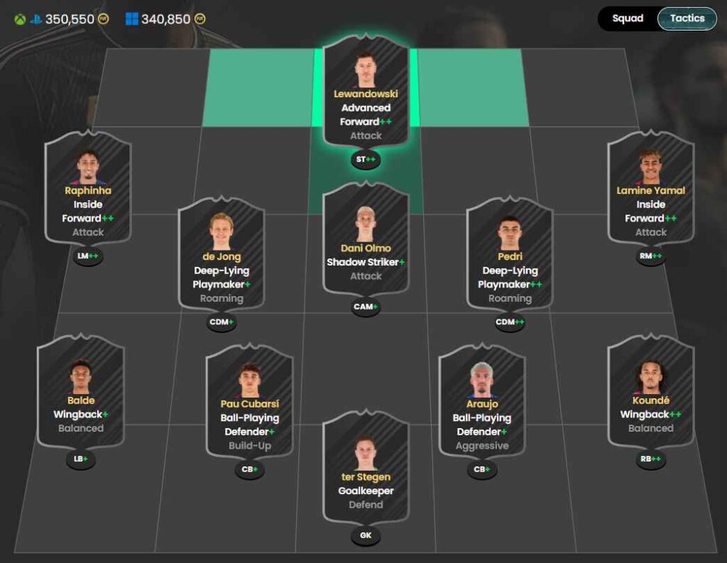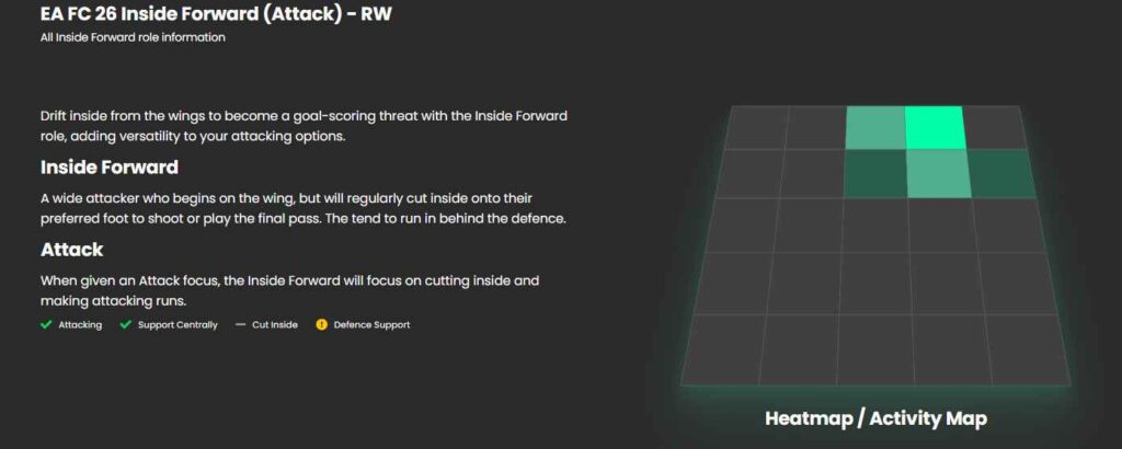حالا که وسط زمین به شکل مناسبی پوشش داده شده و مدافعان کناری نیز فضای جناحین را تحت کنترل خود گرفتهاند، وینگرهای ما باید نقش Inside Forward – Attack را داشته باشند. افرادی نظیر محمد صلاح، وینیسیوس جونیور و لامین یامال به عنوان برترین بازیکنان FC 26 از کنارهها کار خود را شروع میکنند و با برش رو به داخل و حرکات هجومی از سمت مخالف سانترهای تاثیرگذاری خواهند داشت.