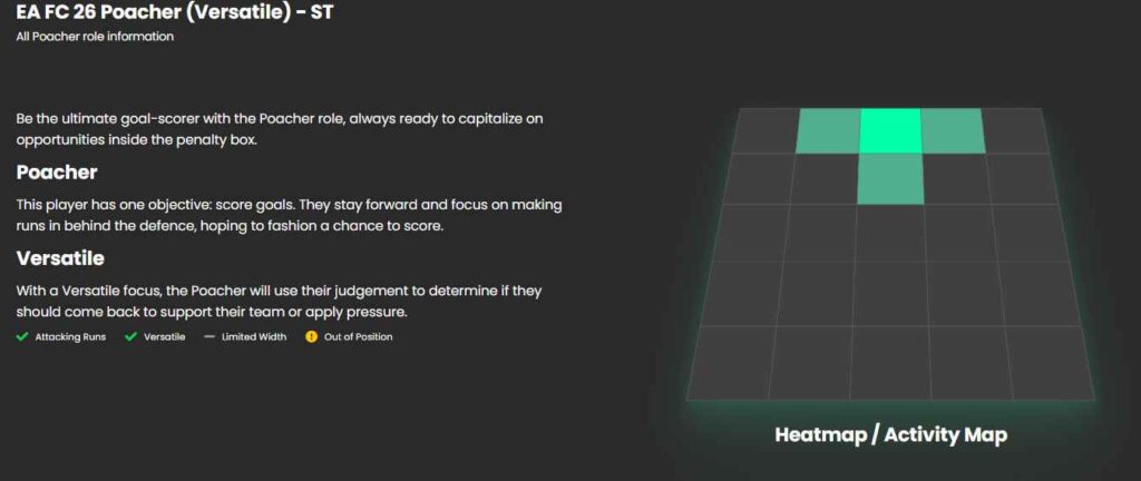 در نهایت برای مهاجم نوک خود نقش Poacher – Versatile را انتخاب کردهایم. این یعنی بازیکنانی نظیر السیا روسو یا الکساندر ایساک باید همیشه در محوطه جریمه باشند ولی زمانی که موقعیت گلزنی خوبی به آنها نمیرسد کمی رو به خط هافبک حرکت میکنند تا صاحب توپ شوند.