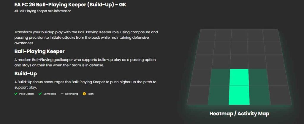 این نقش به دروازهبان (GK) شما دستور میدهد تا به سمت یکسوم دفاعی زمین حرکت کرده (مانند داوید رایا یا الیسون بکر)، نقش یک سوییپر را ایفا کند و در همین حین زمانی که حریف مشغول پرس سنگین است، گزینهای اضافی برای پاسکاری باشد. البته این کار ریسکهای خودش را هم دارد چون حریف با پاسهای بلند یا ضربات چیپ میتواند به راحتی تهدید بزرگی برای دروازه شما ایجاد کند.