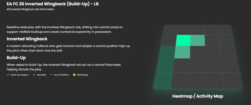 Inverted Wingback نقش مخصوص بازیکنانی نظیر مایلز لوئیس-اسکلی یا مارک کوکوریا است و حکم Falseback در نسخه پیشین افسی را دارد. این دسته از مدافعان کناری (RB و LB) وقتی صاحب توپ میشوند میل بیشتری به حرکت رو به مناطق جلویی زمین دارند. به جای بازی کردن در محدوده هافبکها، شما میتوانید از این نقش برای ایجاد گزینههای پاسکاری تهاجمیتر استفاده کنید و حتی حکم یک تمام کننده را داشته باشید.