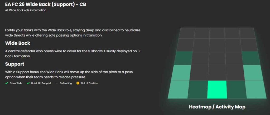 Wide Back به مدافعان میانیای (CB) گفته میشود که احساس راحتی بیشتری حین حرکت در جناحین دارند و با مدافعان کناری راحتتر پاسکاری میکنند. بنجامین پاوارد و پیرو هینکاپی دو مثال خوب از بازیکنان دارای این نقش به شمار میروند. از این نقش میتوانید زمانی که با سه مدافع میانی بازی میکنید بهره ببرید و آن را به دو دفاع سمت چپ و راست بدهید.