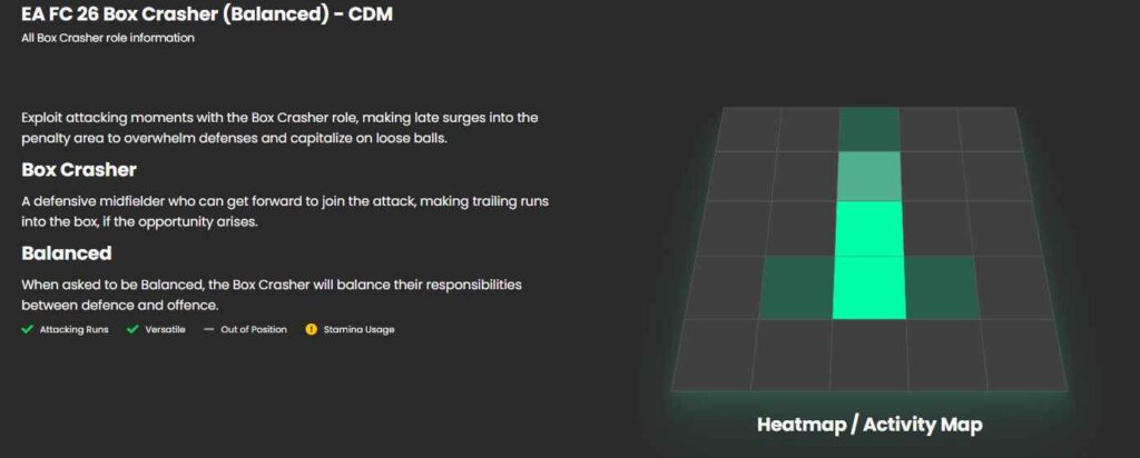اگر میخواهید یک هافبک دفاعی (CDM) مانند دکلان رایس یا پاتری گیخارو داشته باشید که حرکاتی با تاخیر رو به محوطه جریمه حریف دارند و به طور ناگهانی ضربات نهایی را میزنند باید از نقش Box Crasher بهره ببرید. این نقش باعث میشود یک فضای خالی در خط هافبک شما ایجاد شود، پس بازیکنی با انرژی یا Stamina بالا برای آن انتخاب کنید.
