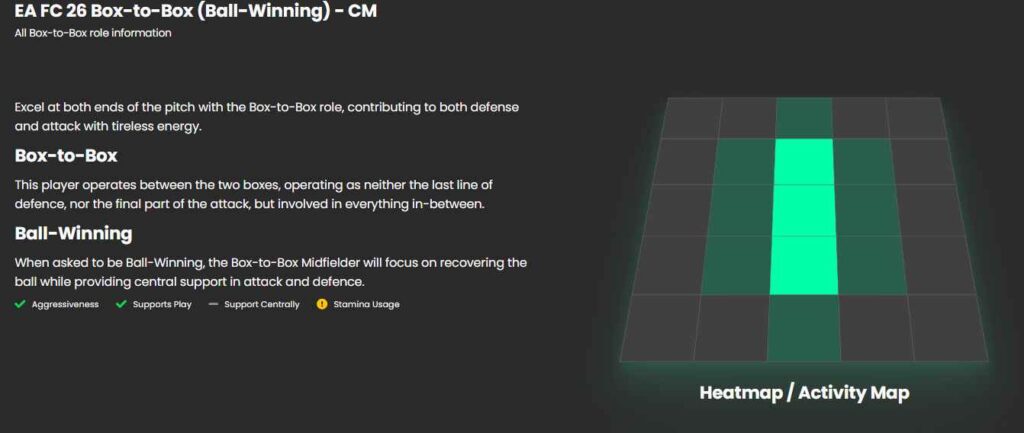 برای عملکرد بهتر هافبکهای دفاعی که دیرهنگام به حمله وارد میشوند، هافبکهای میانی باید نقش Box-To-Box – Ball Winning را داشته باشند. بازیکنانی مانند فدریکو والورده که جزو بهترین هافبکهای بازی FC 26 نیز به شمار میرود با داشتن این نقش تکلهای مهم و محکمی خواهند زد و به طور همزمان در روند حمله نیز تاثیرگذار ظاهر میشوند.