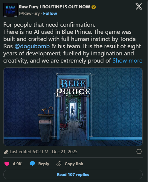 استودیوی Raw Fury در بیانیهای تاکید کرد Blue Prince و تیم سازنده آن هیچگاه از هوش مصنوعی مولد استفاده نکردهاند. در متن بیانیه آمده است: