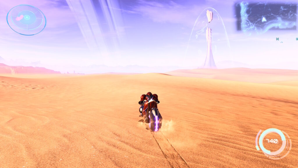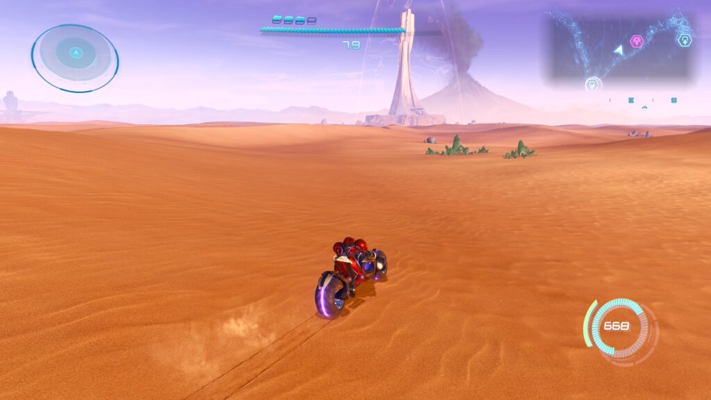 پس بیایید به حاشیهسازترین بخش بازی نگاهی داشته باشیم. بیابان Sol Valley که همان بخش جهانباز بازیست و همانند یک هاب دیگر مناطق بازی را به یکدیگر وصل میکند و در آن میتوانید با موتوری بهنام Vi-O-La به نقاط مختلفش سفر کنید. نکات مثبت این مپ؟ کنترل موتور سرگرمکننده است. اما بهغیر از آن، متاسفانه باید بگویم هرچیزی که راجع به Sol Valley شنیدهاید درست است؛ این بیابان نه محتوای جالبی دارد، نه دشمنان سرگرمکنندهای دارد و نه حتی از نظر بصری و اتمسفری حرفی برای گفتن دارد. علاوه بر ورودی آن پنج منطقه، این مپ شامل سه دانجن زلدا مانند بسیار کوچک و شش ویرانه میشود که هر وقت قابلیتهای لازم برای گذر از چالشهایشان را داشته باشید، هر کدام نهایتا پنج دقیقه از شما وقت میگیرند. چیزی که عمده وقتتان را در این بیابان میگیرد، کریستالهای سبز رنگی هستند که در سرتاسر مپ پخش شدهاند. این کریستالها حاوی انرژی سبز هستند که جمعآوری آنها میتواند بهبودهایی همچون افزایش صدمه گلولههای عادی برایتان به ارمغان آورد.