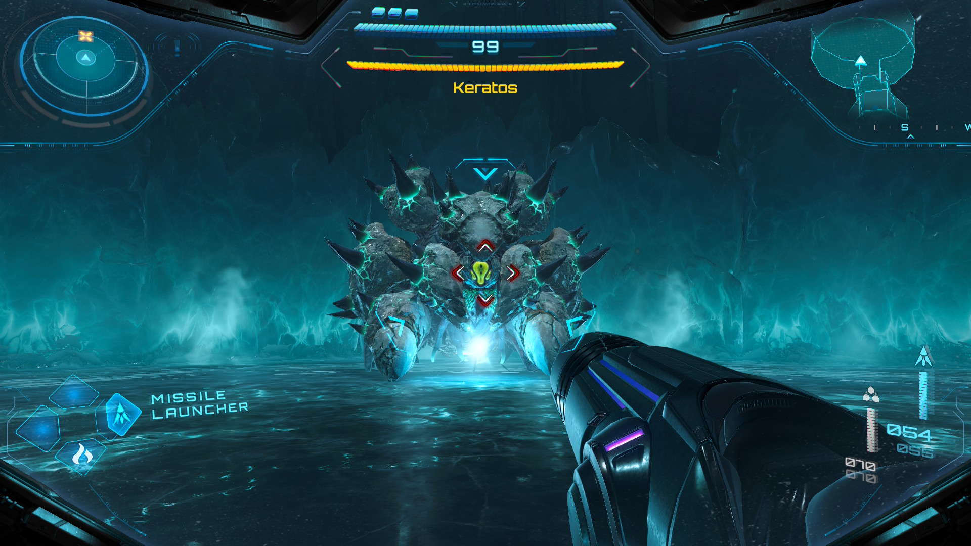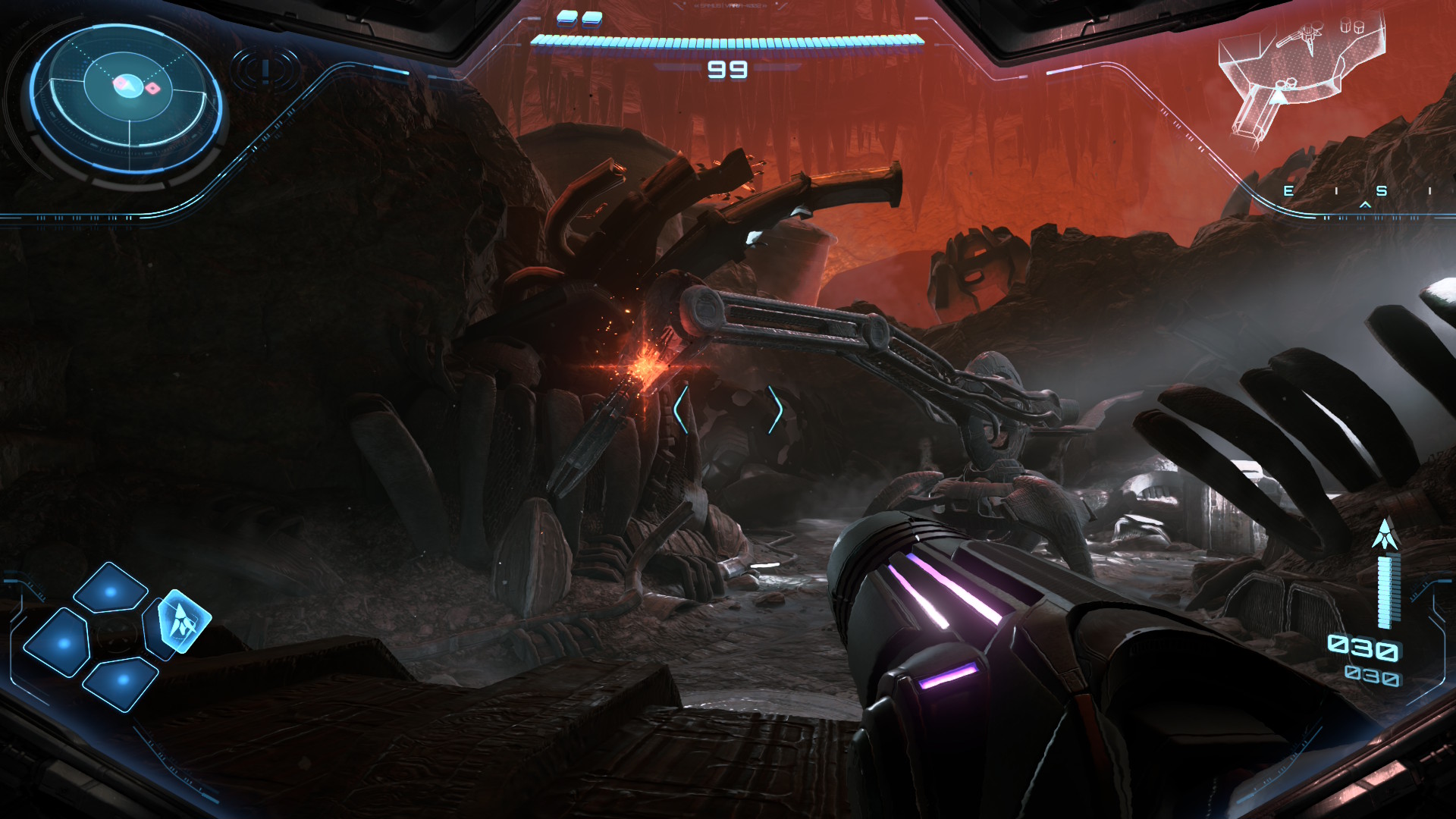 بخش مبارزات هم جایی بود که من را غافلگیر کرد. کامبت Metroid Prime 4 به هیچ شکلی سیستم پیچیدهای نیست و دشمنان هم تنوع بالایی ندارند، اما باز هم این سیستم شما را درگیر میکند. شما علاوه بر تیرهای ساده و شارژی عادی خود، بهمرور زمان قابلیت شلیک موشک و تیرهای آتشین، یخی و برقی را هم بهدست خواهید آورد. بخشی از کاربرد این مهمات ویژه برای باز کردن در اتاقها و مسیرهای جدید است، اما آنها در مبارزات هم میتوانند بسیار کاربردی باشد. برای مثال یک ربات میتواند با گلولههای برقی شما دچار اختلال شود و نتواند موشکهایش را با دقت به سمت شما شلیک کند، یا دشمنی که در حالت عادی سخت از بین برود، با گلولههای آتشین به سرعت جان خود را از دست بدهد. تظاهر نمیکنم که چنین تعاملاتی با دشمنان چیز عجیب و غریبی است، اما خوب کار میکند و مبارزات بازی را از چیزی که در ظاهر بهنظر میرسد، سرگرمکنندهتر میکند. این را مخصوصا میتوانید در باسهای بازی ببینید که خلاقانهتر و حتی چالشبرانگیزتر از چیزی هستند که تصور میکنید و قطعا جزو بهترین بخشهای بازی محسوب میشوند.