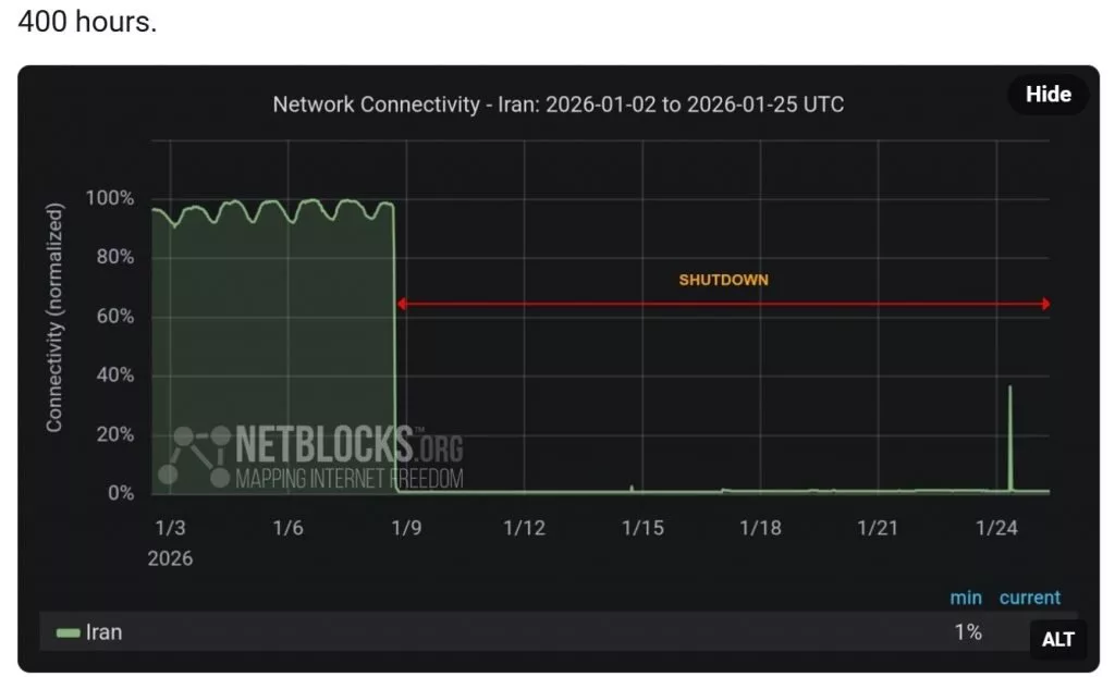 نهاد پایش اینترنتی نتبلاکس در گزارش جدیدی اعلام کرده که قطعی اینترنت در ایران از ۴۰۰ ساعت گذشته و همچنان میزان دسترسی به شبکه جهانی حدود یک درصد است. نتبلاکس وضعیت قطعی اینترنت ایران را تنها با دو کلمه توصیف کرد: «۴۰۰ ساعت.»