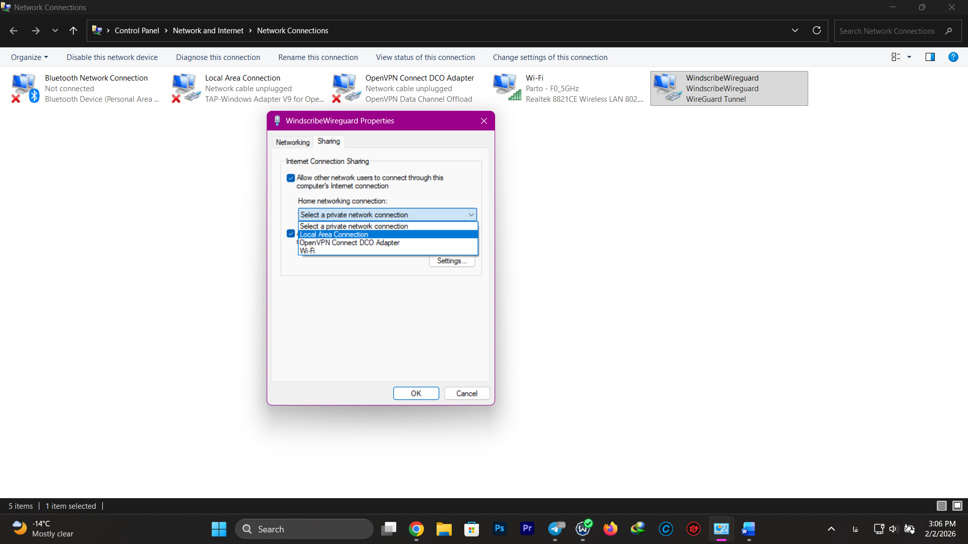 - اگر در مرحله اتصال کنسول به ویپیان با خطا مواجه شدید، یکبار تنظیمات مربوط به آداپتور ویپیان را به حالت پیشفرض برگردانید و مجدد از تب Sharing آن را فعال و اتصال درست پیسی به کنسول را انتخاب کنید.