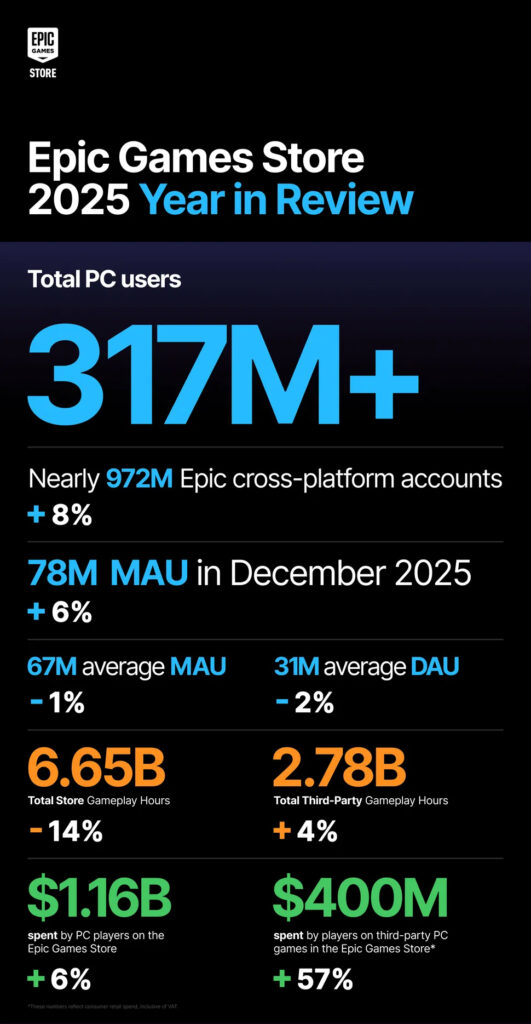 تیم Epic Games گزارشی جامع از عملکرد فروشگاه اپیک گیمز در سال میلادی گذشته منتشر کرد که نشاندهنده رشد چشمگیر این پلتفرم بود. طبق این گزارش، تعداد کاربران فروشگاه به بیش از ۳۱۷ میلیون نفر رسیده و در سال ۲۰۲۵ تعداد کاربران فعال ماهانه به ۷۸ میلیون نفر افزایش یافته است. دلیل شهرت اصلی این فروشگاه مربوط به ارائه بازیهای رایگان به طور پیوسته است که در سال ۲۰۲۵ هم ادامه یافت و اپیک گیمز صد بازی رایگان را در اختیار کاربران قرار داد. این بازیها بیش از ۶۶۲ میلیون بار دانلود شدند و به طور میانگین هر کاربر ۲۳۱۶ دلار به ارزش دریافتشده از این بازیها دست یافت.