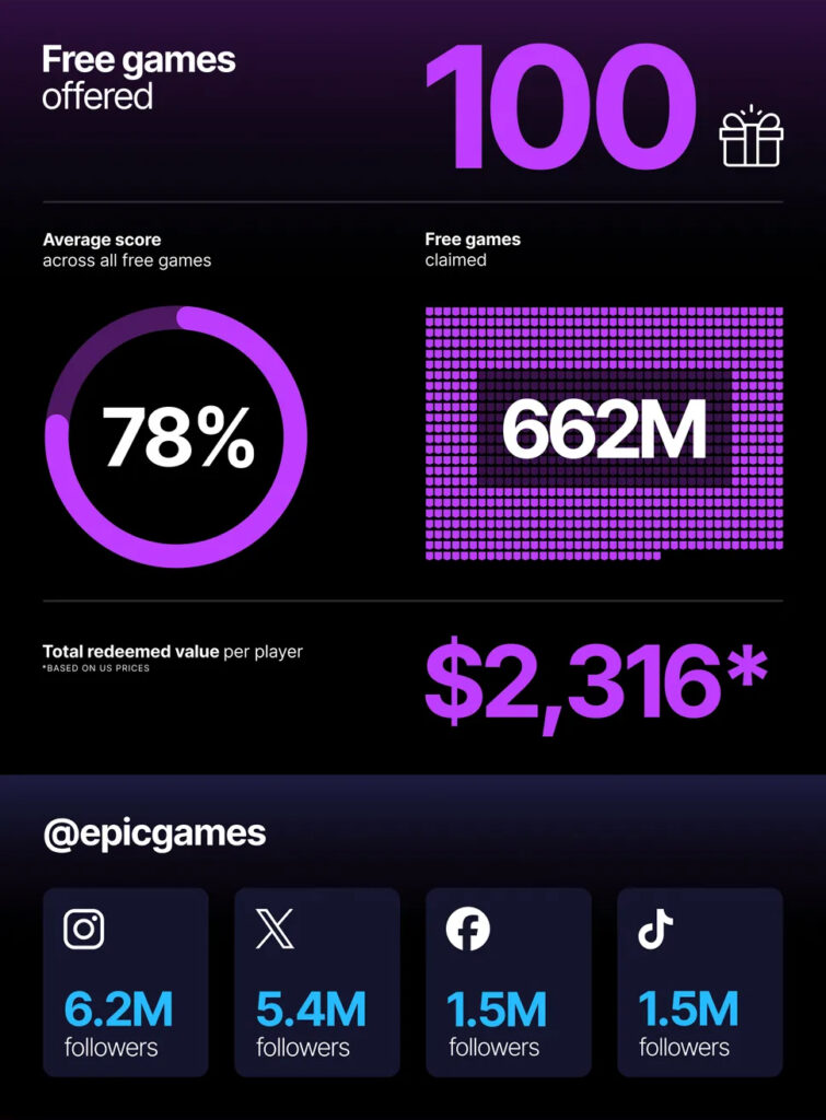 تعداد حسابهای کاربری اپیک گیمز اکنون نزدیک به یک میلیارد نفر است و بیشتر این افراد از فروشگاه Epic Games استفاده میکنند. از ژانویه تا دسامبر ۲۰۲۵ صد بازی رایگان در دسترس قرار گرفت و ۷۷ درصد از این بازیها موفق به ثبت رکورد تاریخی تعداد بازیکن همزمان شدند. همچنین ۴۰ درصد از این عناوین افزایش بازیکن در استیم را تجربه کردند.