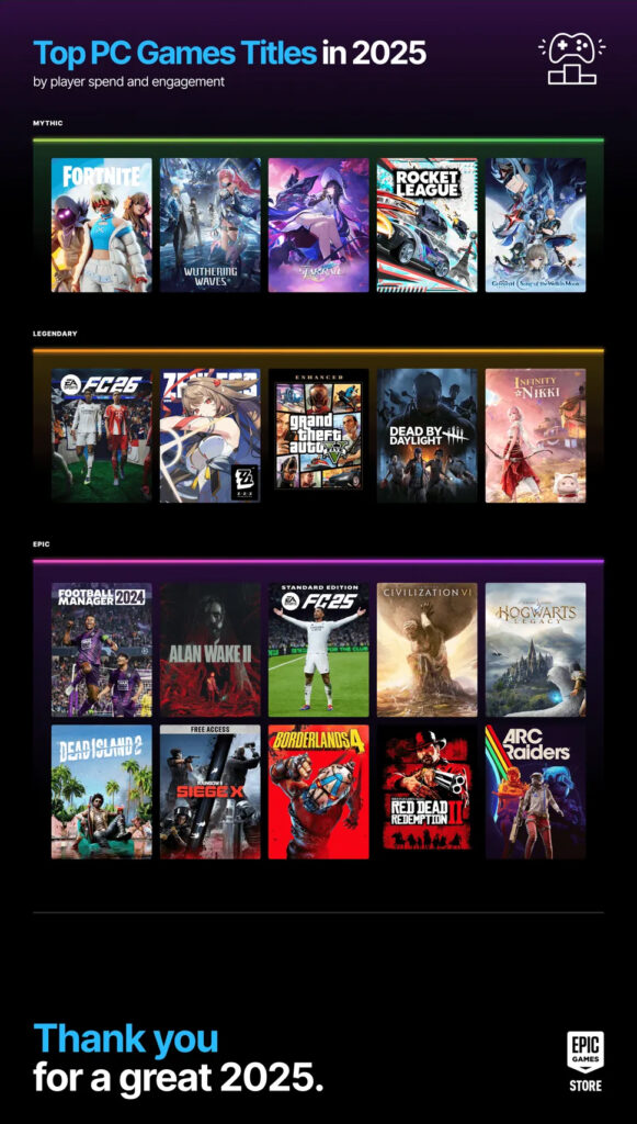 پنج بازی برتر فروشگاه Epic Games بر اساس میزان خرج و مشارکت بازیکنان در سال ۲۰۲۵ عبارت است از:
