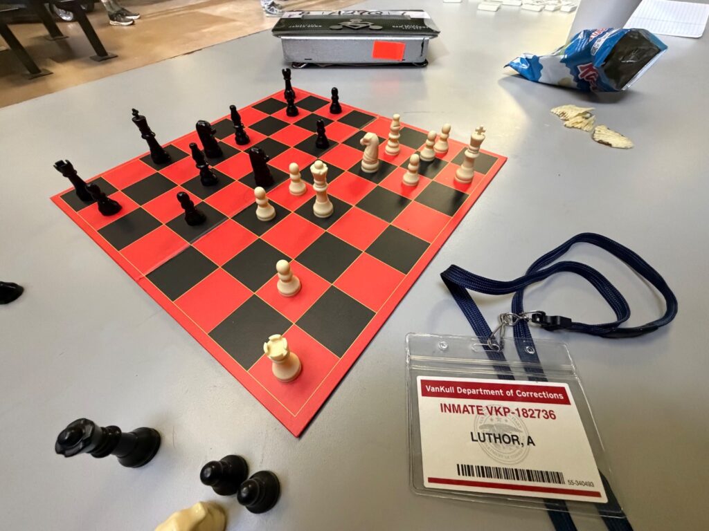 صفحه شطرنج هم برای طرفداران کمیک یادآور صحنههایی است که سوپرمن برای یک رقابت دوستانه به ملاقات لکس لوتر در زندان میرود. همچنین کارت شناسایی نشان میدهد لکس لوتر به زندان جدید Van Kull Department of Corrections منتقل شده و پیشتر در Belle Reve به سر میبرده است.