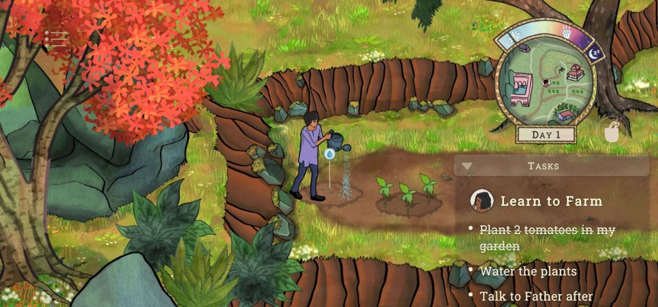 گیمپلی بازی بر پایه یک چرخه روزانه طراحی شده که شامل کاوش، جمعآوری منابع و مدیریت مزرعه است. بازیکن باید در طول روز به جستوجوی مواد اولیه بپردازد و از آنها برای ساخت آیتمها یا کاشت محصولات استفاده کند. مراقبت از گیاهان، بهویژه آبیاری منظم، بخش مهمی از این روند است و به نوعی ستون اصلی فعالیتهای روزانه را تشکیل میدهد. این ساختار، حس آرامش و تداوم ایجاد میکند و بازیکن را بهتدریج در ریتم خاص بازی غرق میسازد.