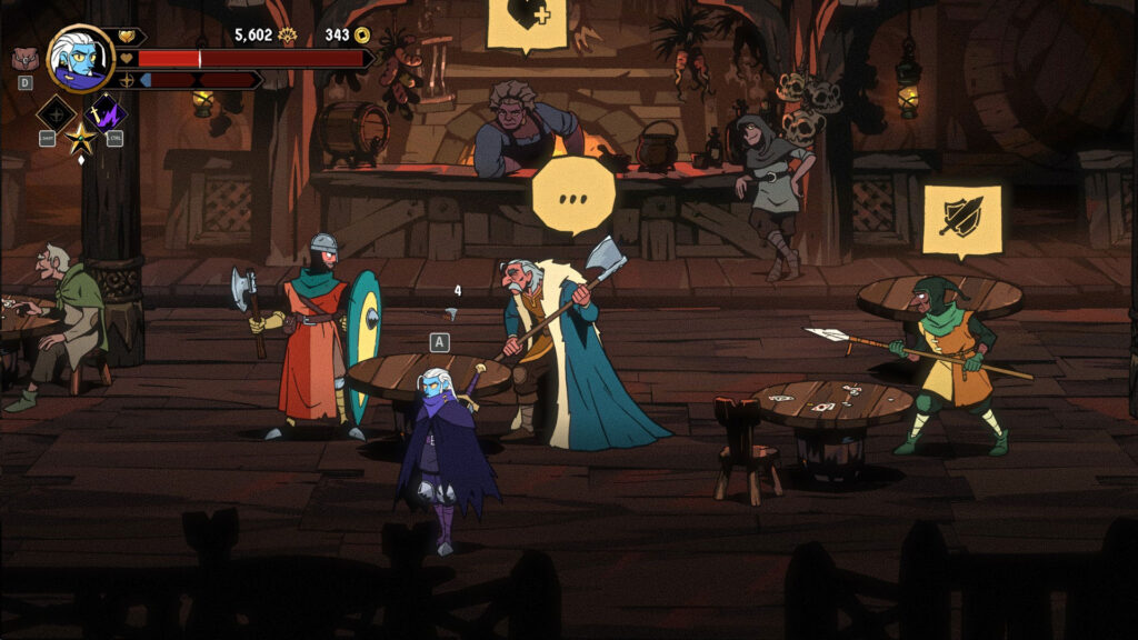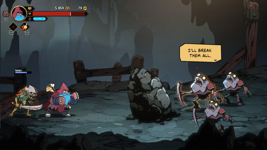 برای بررسی گیمپلی بازی Absolum ابتدا به صورت جداگانه به هر بخش آن میپردازم و سپس از نتیجه ترکیبشان میگویم. درباره بخش Beat ‘em up که هسته مبارزات آن را تشکیل میدهد، باید بگویم که بدون شک با یکی از بهترین آثار این سبک در چند سال اخیر طرف هستید. بازی در کل چهار شخصیت قابل بازی دارد که دوتای آنها از ابتدا در دسترساند و دوتای دیگر با پیشروی در دسترس قرار میگیرند. سازندهها به وضوح وقت زیادی را به متمایز کردن این چهار مبارز از هم اختصاص دادهاند و نتیجه واقعا لذتبخش است. شخصیت Galandra به عنوان یک الف، آن شخصیت بالانس است که در هیچ بخشی برتری قابل ملاحظهای ندارد. اما در عوض Karl از نژاد دورف مشتهای سنگین و مرگباری دارد و ایدهآل آنهایی است که دنبال شخصیت با دمیج بالا میگردند. شخصیت Cider چابکترین مبارز این گروه است و با دست مکانیکیاش میتواند خود را سریع به دشمن برساند و در نهایت Brome را داریم که به عنوان یک جادوگر، قادر است فاصله خود با دشمنان را حفظ کند.