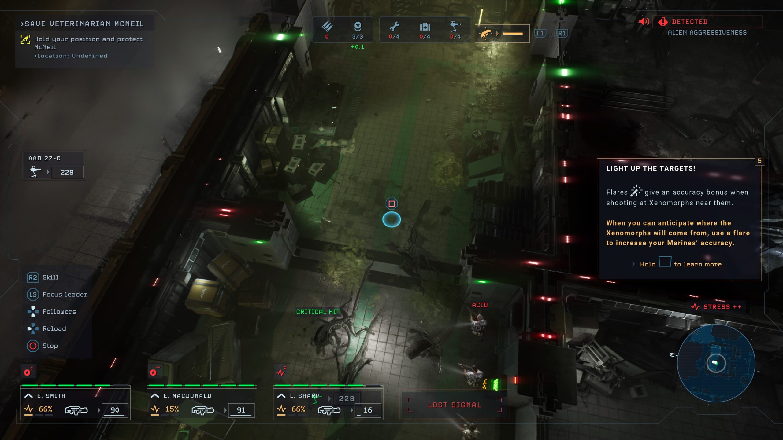 گیمپلی بازی شخصا من را یاد بازیهای Commondos انداخت؛ اما این بازی است که شاید خیلی از شما یادتان نیاید از همین رو بد نیست به عنوان تازهتر XCOM اشاره کرد که بهنظر میرسد الهامبخش اصلی سازندگان بازی هم بوده. برخلاف اکسکام اما بازی نبردهای نوبتی ندارد و همه چیز در آن به صورت Real-time پیش میرود. میتوان گفت بازی Aliens: Dark Descent یک اکشن تمام عیار است که صرفا دوربینی ایزومتریک را برای نمایش بصری خود انتخاب کرده و یک سری المان بازیهای مدیریتی را نیز درون خود قرار داده تا با یک ترکیب خوشمزه روبرو شویم.