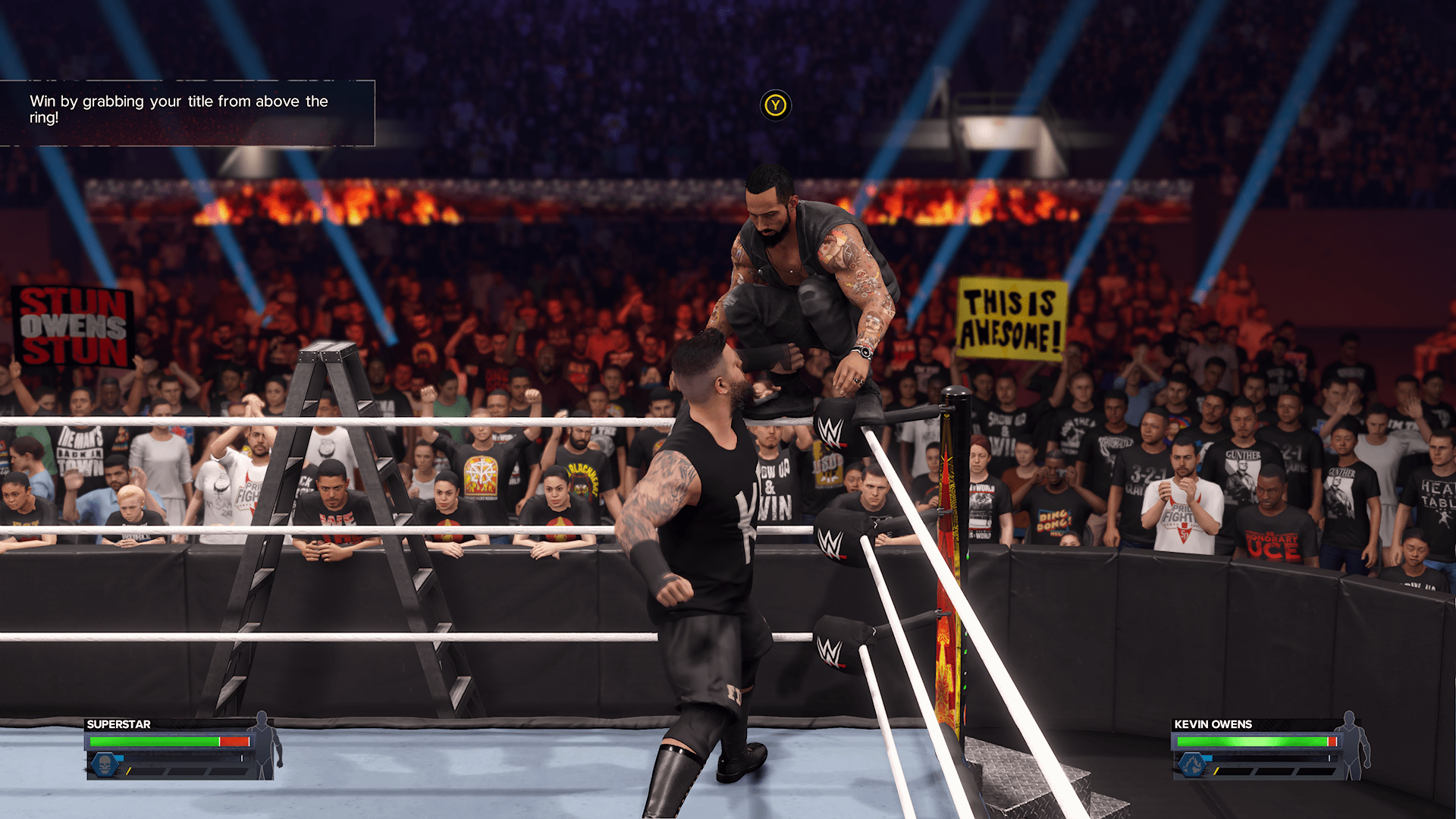 یکی از مفهومهایی که سبب میشود تا WWE 2K24 موفقتر از هر عنوان ورزشی دیگری عمل کند، توجه به ذات مسابقاتی است که از آنها الهام گرفته. سمت چپ بالای تصویر، همواره ستارههایی به چشم میخورند که میزان رضایت هواداران از مسابقهی در حال انجام را نشان میدهند. تنوع ضربات، همراهی با مخاطب حاضر در سالن، رفت و برگشت بین دو سوپراستار و ... جزو المانهایی هستند که روی میزان ستارههای دریافتی در هر مسابقه موثر هستند. بالا بردن ستارهها، یعنی گرفتن امتیاز بیشتر و این یعنی یک مسابقهی ریسک/جایزه درجه یک. خیلی مواقع میتوانید زودتر مسابقه را تمام کنید و بهواسطهی برتری اول مسابقه، بازی را به نام خودتان جاودان کنید. گاهی هم ممکن است با تعلل و یکی-دو اشتباه، بازی برده را صرفا برای جذابتر کردنش برای تماشاگر ببازید. ایجاد تعادل بین میزان جایزه دریافتی از هر مسابقه و البته مدیریت مبارزه، ترکیبی است که موفقیت بازی را تضمین میکند.